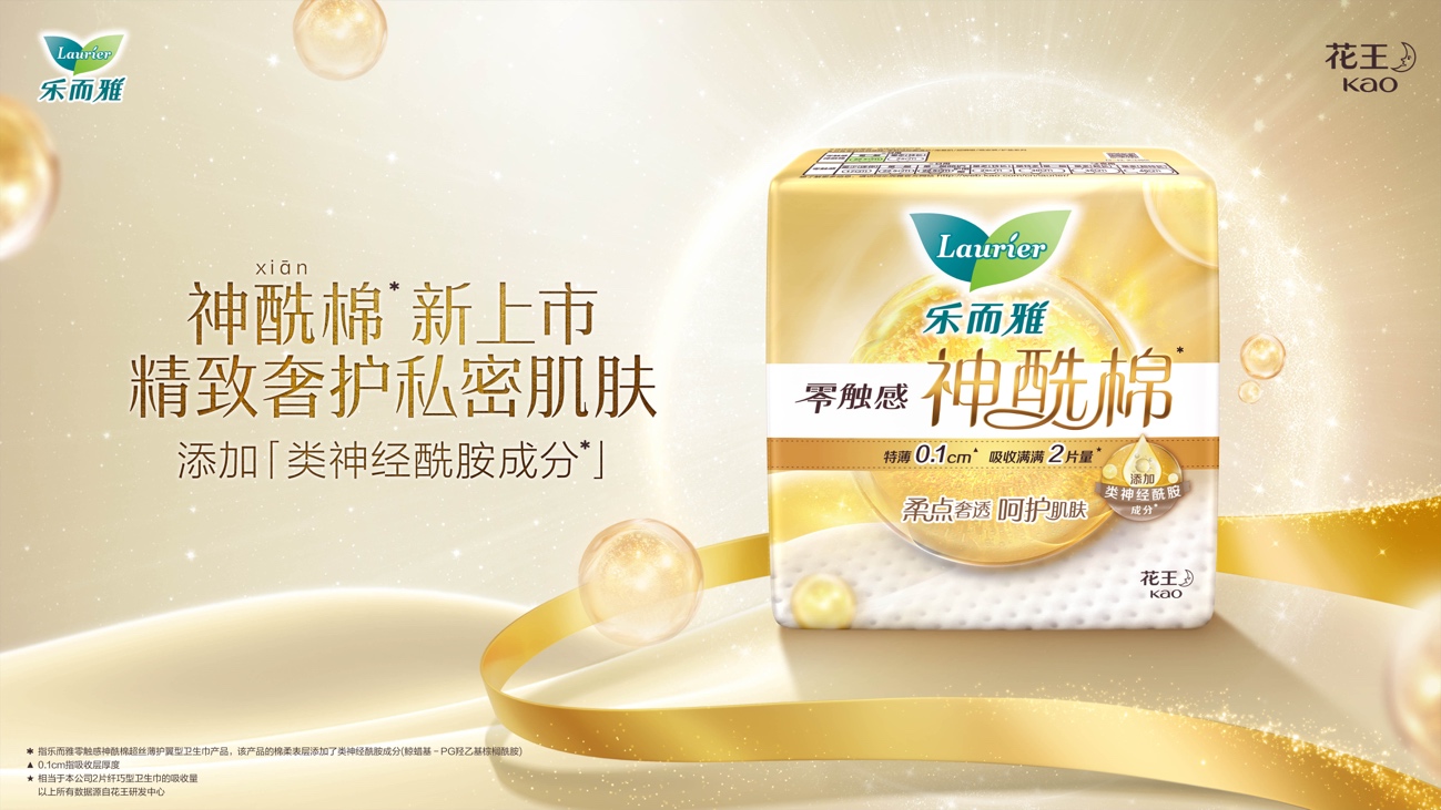 花王“乐而雅”秉持着“你舒服,更重要”的品牌理念,长期致力于为女性提供更舒适的生理期体验。新品“乐而雅零触感神酰棉” 采用柔点奢透表层, 薄薄一片,给予“奢柔”、“奢透”和“奢护”的三重呵护。 “乐而雅零触感神酰棉”表层柔点设计帮助减少肌肤与巾身50%的接触面积*1,缓解摩擦感,“奢柔”亲肤;表层中的凹凸构造形成中空结构利于纵向透气,透气率*1提升230%,让生理期的私密肌肤远离闷湿黏腻困扰,畅享“奢透”舒爽。同时添加花王专研“类神经酰胺成分”*2和三大天然植物精粹*3,“奢护”敏感脆弱的私密肌。 自1985年“花王”发现了肌肤保湿和屏护的关键——“神经酰胺”,至今对该成分的研究已长达40年。神经酰胺在皮肤护理中具有重要作用。它能够通过稳固角质层,渗透角质层深处,填满角质细胞间的空隙,与皮肤本身的神经酰胺和角质细胞一起形成紧密网状结构,从而增强皮肤屏障功能,改善干燥缺水的肌肤状态,在花王旗下的产品中得到广泛应用。