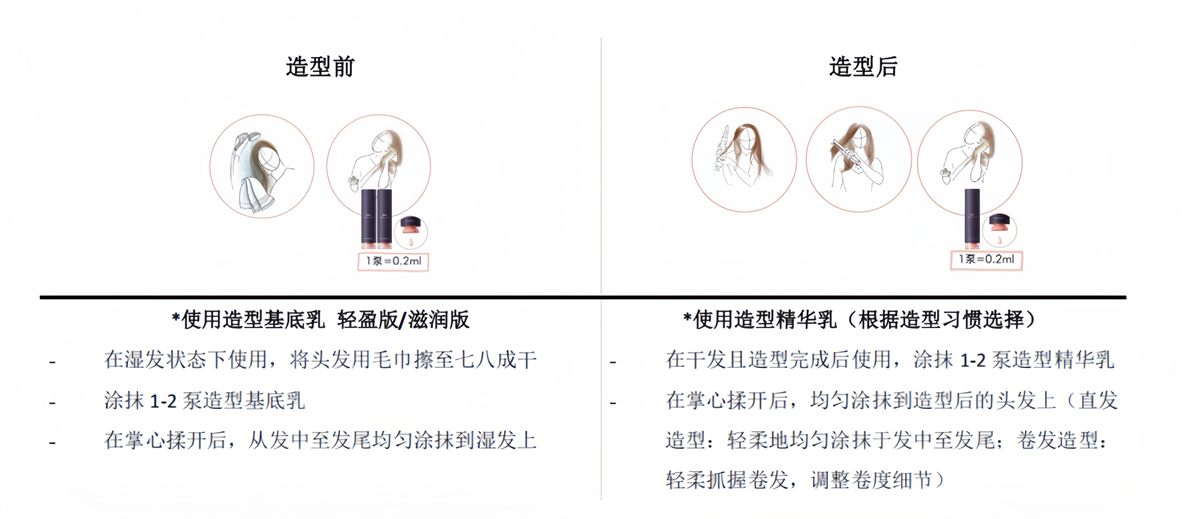 ●造型前后轻轻一抹,顺滑闪耀发丝,造型整日持久 为了更好地帮助用户了解并使用产品,戴森也贴心提供了Chitosan™润养造型系列的使用指南。在洗完头不滴水的湿发状态下,使用1-2泵的Chitosan™造型基底乳,在掌心轻轻揉开,再进行均匀涂抹,不仅可以帮助滋润并保湿秀发,更能有效实现高达230℃的隔热防护。接着,在吹干发丝及完成造型以后,可搭配使用1-2泵的造型精华乳,于掌心揉开后,均匀涂抹于造型后的头发,不仅能够改善毛鳞片热损伤达12%,减少高达95%的断发,更能让造型整日持久,灵动闪耀。