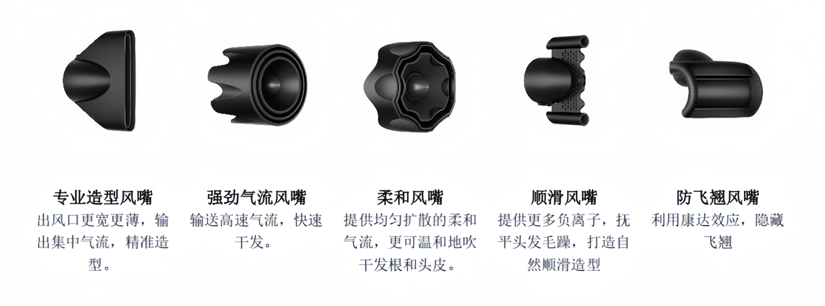 ●五款智能风嘴,居家解锁沙龙级高效、精准造型 为满足用户日常多样化的造型需求,戴森Supersonic r™精准造型吹风机配备了5款智能风嘴,其内置射频识别(RFID)传感器,使机身能够快速识别风嘴并自动匹配推荐的风温和风速。当用户自定义设置风温和风速后,吹风机将“记住”使用偏好,下次开机时将沿用上次的使用设置,大大简化造型流程,让日常打造多元造型变得高效便捷。