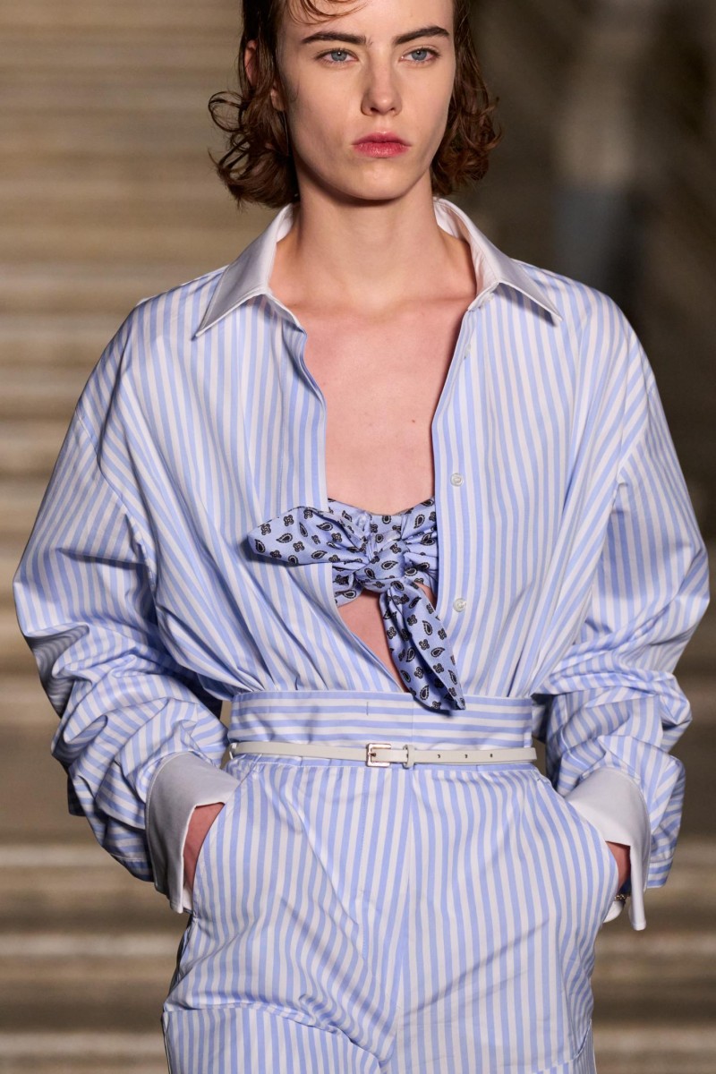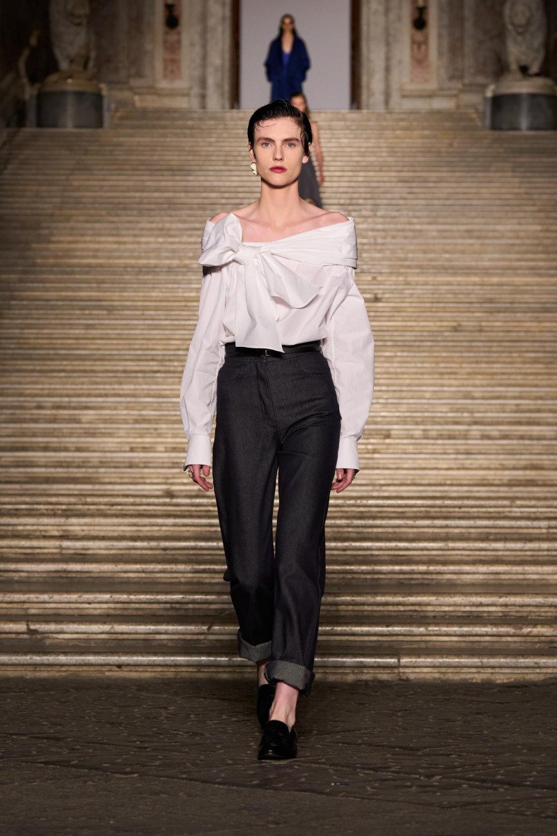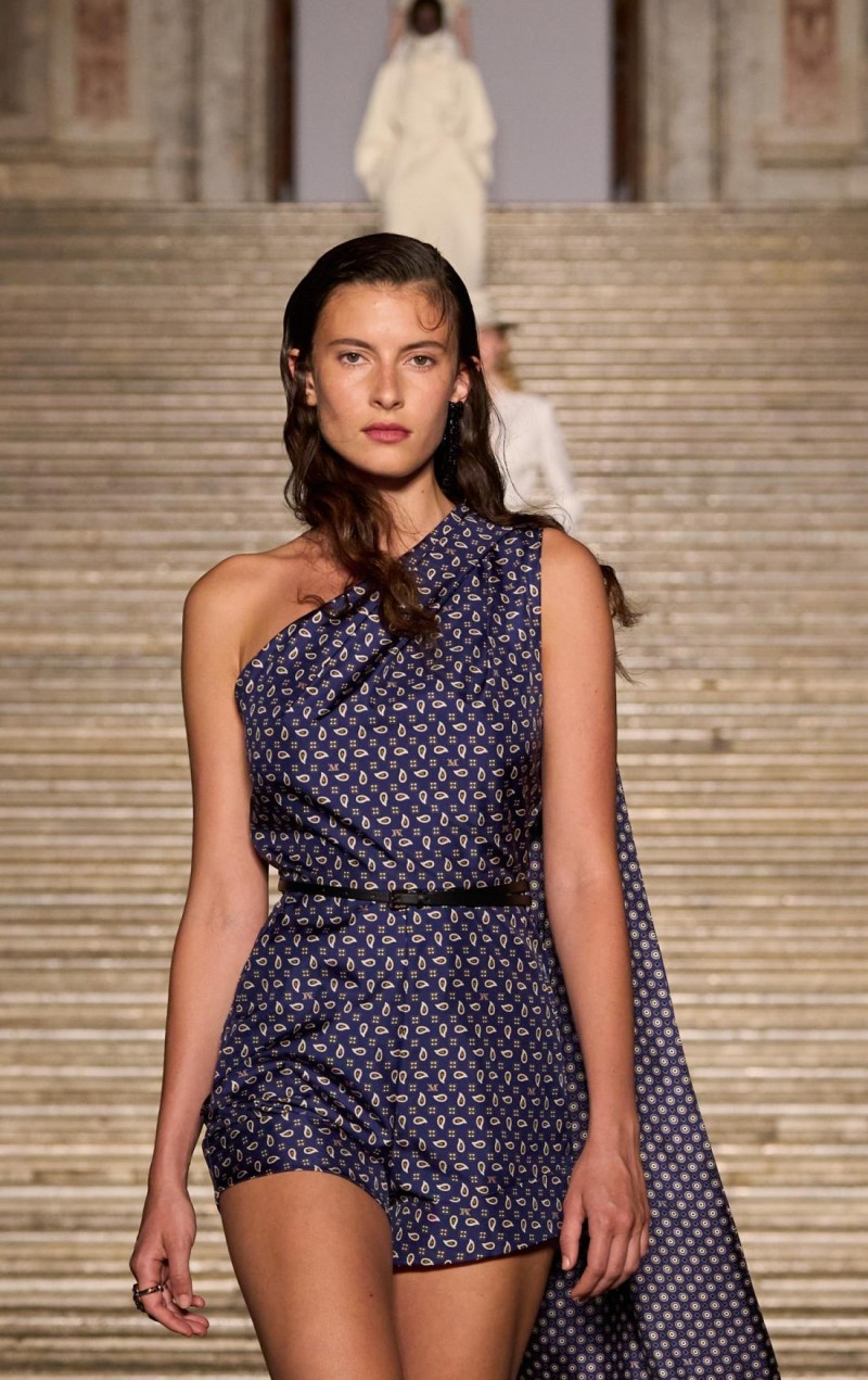 卡塞塔王宫时装秀现场 (图片拍摄by JASON SCHMIDT) 1951 年的那不勒斯,既有肖瓦娜·曼加诺 (Silvana Mangano) 和索菲娅·罗兰 (Sophia Loren) 的都市魅影,也有街头雅痞的潇洒倜傥。这片文化土壤孕育出 Marinella 品牌,其精致领带成为优雅风范与裁艺美学的象征。本季,Max Mara 与 E. Marinella 倾情联袂,溯源 1951 年的领结印花纹样,运用于质感考究的真丝睡衣之上,或以刺绣工艺放大图案,装点于羊绒毛衣之上,呈现于本季秀场部分造型之中。
