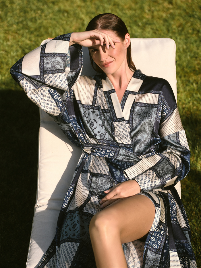 Giorgio Armani与KITH合作的第二篇章延续至臻工艺,以顶级材质勾勒匠心廓形。 男士系列的核心款式包括双排扣西装外套、联名衬衫、印花裤装、飞行员夹克、 以及百慕大短裤。其中,双排扣西装外套作为首推廓形,采用斜纹真丝面料,双排扣设计配以一对大款前襟口袋,完美诠释低调奢华的典范。此次, Giorgio Armani与KITH更是首度推出女士胶囊系列。从Giorgio Armani档案中汲取永恒优雅风范, 融合休闲元素,为夏日穿搭赋予多元可能。 女士系列以奢华连衣裙、外套与短袖构成核心阵容。Giorgio Armani与 Kith 联名外套采用锤纹真丝缎精制,蓝调拼贴印花搭配联名徽标暗纹演绎精致美学,采用其结构化衣领与宽长衣袖设计,腰间自系腰带设计可随性系带固定。