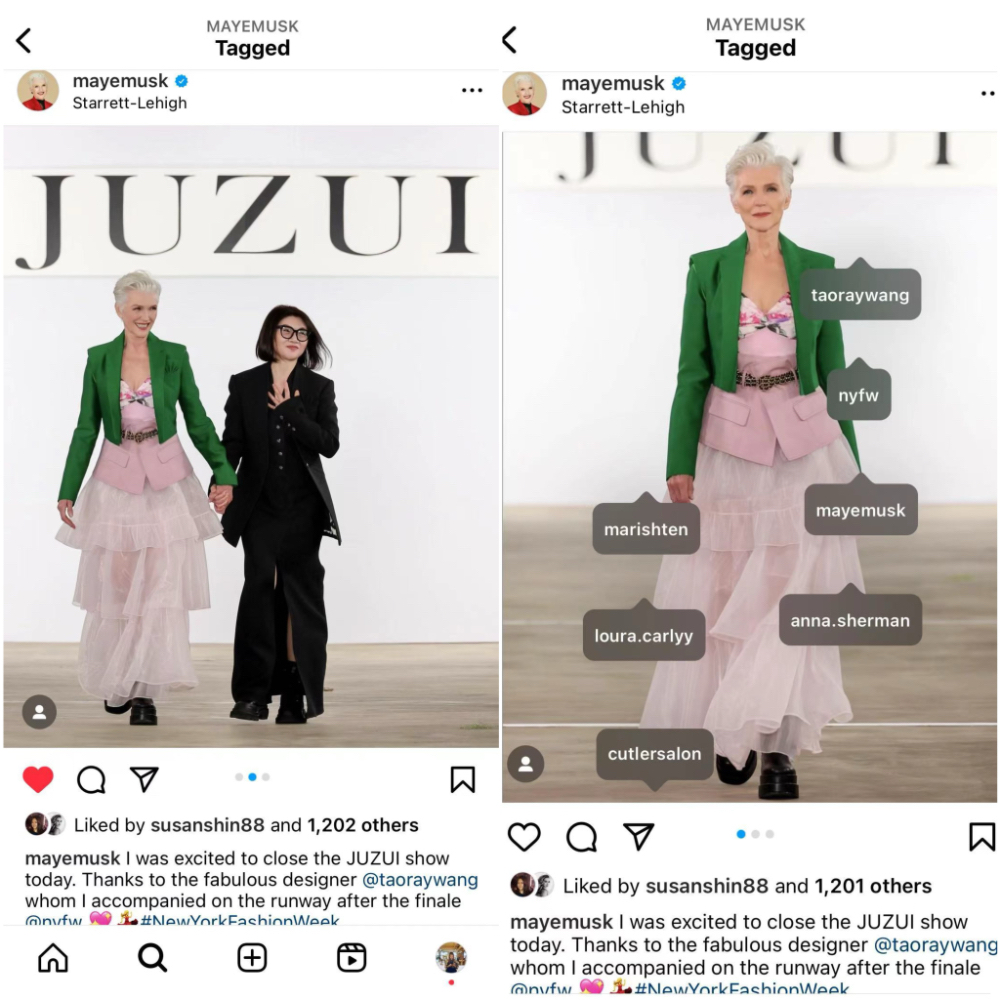 国际时尚ICON、国际首富埃隆·马斯克的母亲——梅耶·马斯克一身“粉花绿萼”压轴惊艳登场,并在秀后第一时间发文ins:“Thanks to the fabulous designer @taoray wang (王陶)!”