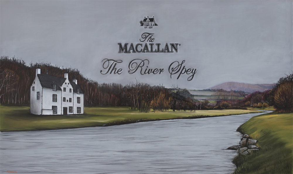 此外,米歇尔运用天然颜料创作了六幅以斯佩河为主题的粉彩画。这套作品以饱满的色彩和写实主义艺术手法栩栩如生地呈现这条河流的壮美之姿,巧妙描摹出其波光粼粼的灵动魅力。麦卡伦单一麦芽威士忌的纯天然色泽与斯佩河及其周围自然景观的色彩拥有共通的视觉语言,而米歇尔的作品精妙地捕捉到这些自然色彩交融的美感。