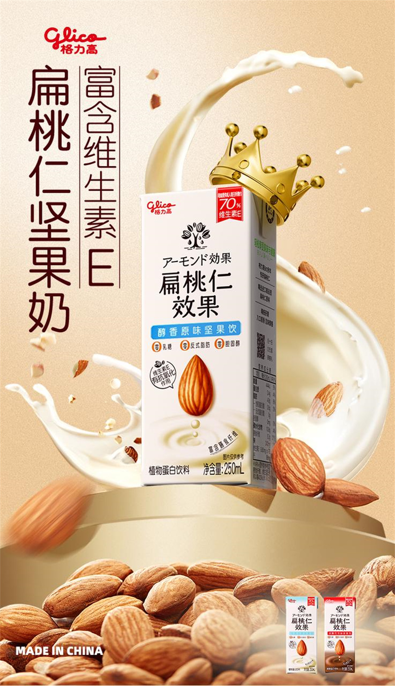 扁桃仁效果 轻松美丽应援 2021年,格力高旗下的一款植物蛋白饮“扁桃仁效果”正式在中国上市。扁桃仁效果主打植物基健康饮品,0乳糖、0胆固醇、0反式脂肪,不会给身体造成额外负担,只提供健康的膳食补给。因其“美味又健康”的特性,深受消费者的关注与喜爱,是市场上极具代表性的健康饮品之一。 扁桃仁中富含维生素 E、膳食纤维与钙,维生素E具有抗氧化的作用,膳食纤维可以维持肠道正常功能。与食用扁桃仁坚果相比,饮用液体扁桃仁奶,营养更易吸收。