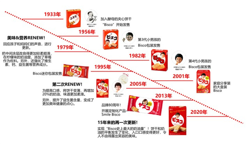 在上市的90余年间,Bisco必思可顺应时代发展及消费升级趋势,对产品配方、包装等方面不断打磨与探索。1970年,Bisco必思可在配方中加入从番木瓜果实中提取的蛋白分解酶,使得饼干的口感更加松软,也更利于消化吸收。1979年,配方再一次更新,在丰富了口感的同时增加了顺滑度,美味新升级。自1980年以来,益生菌功效也在逐步加强,2020年之后,又加入了膳食纤维等有益成分。这些成分的加入,不仅丰富了产品的营养价值,还有助于提高益生菌的活性,从而更好地发挥其功效。除了“美味”方面,为更好地满足消费者对于健康产品的需求,“健康”方面也再度升级,添加了维生素B1、维生素B2、维生素D、钙等多种营养成分。2005年,奶油用量提升20%,益生菌含量也大幅提升,口感优化,营养升级,践行“美味与健康”的理念。