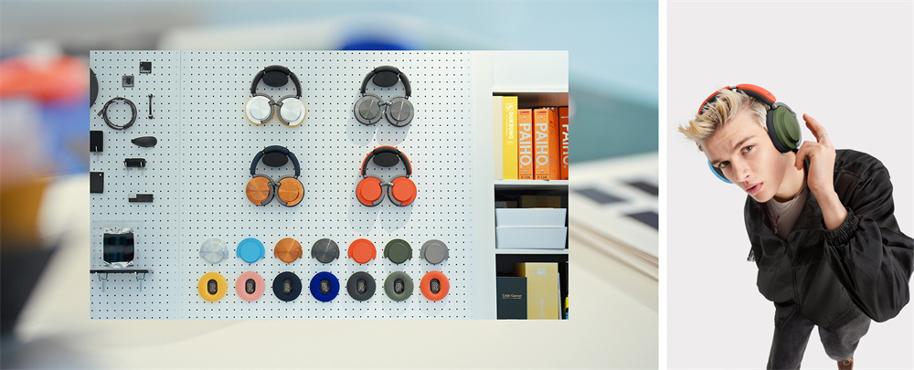左:Dyson OnTrac 降噪耳机配件展示图;右:Dyson OnTrac 降噪耳机模特佩戴图