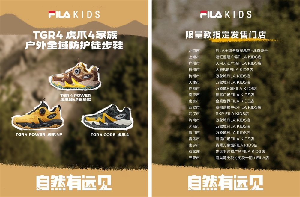 FILA KIDS专注于提供高品质的儿童运动装备,支持孩子们在日常生活和户外运动中的全面成长。此次推出专业户外鞋服,为孩子们户外活动提供全面防护。虎爪鞋家族矩阵分为TGR 4虎爪鞋4 轻户外徒步鞋、TGR 4 POWER虎爪鞋4P户外全域防护徒步鞋、虎爪鞋4P德爷限量款。虎爪鞋4,覆盖大小童年龄尺码,满足大众露营、爬山、旅行、溯溪等日常户外活动需求,在前掌防穿刺、中底轻盈、面料防泼水上做了提升,让孩子在山野舒适,撒欢不累脚 ; 虎爪鞋4P在湿地防滑抓地和防水透气性上有Vibram Megagrip和eVent两大户外顶级科技加持,适合更专业的徒步探索,包括雨林、雪地、沙漠等, 同时保留了4代核心的前掌防穿刺性能,做到不同复杂路面全方位的防护,助力孩子尽情探索放肆野。同时本次虎爪鞋4P还和户外顶级专家德爷的合作,开发设计了灵感来源于德爷860天穿越亚马孙河的限量款,限量188双,仅在FILA KIDS指定形象店销售。整体产品的升级,体现了FILA KIDS户外产品的匠心,对孩子远见的支持,鼓励孩子们像德爷一样勇敢地去探索,在自然遇远见。
