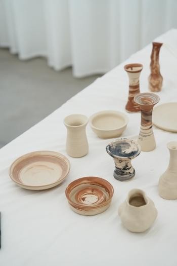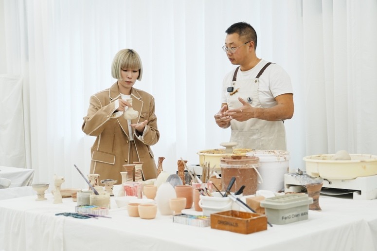 沉浸式体验——在瓷器工坊中感知时间的温度 此次上海预览会不仅展示了Feng Chen Wang 2025春夏系列的完整设计作品,还特别设置了陶瓷手作工坊,提供沉浸式互动体验。邀请资深手工艺人现场指导,让每位参与者通过亲手塑造陶土,体验瓷器制作的精妙过程。嘉宾们亲手制作瓷器,更加贴近Feng Chen Wang本季服装的灵感源泉,沉浸式感知时光与工艺之美。瓷器的裂纹、釉面的变化,这些由时间雕刻的痕迹,在手工艺的创造中重新赋予新意义。在这里,时装与手工艺超越了视觉享受,演变为触觉的探索与文化的沉淀。