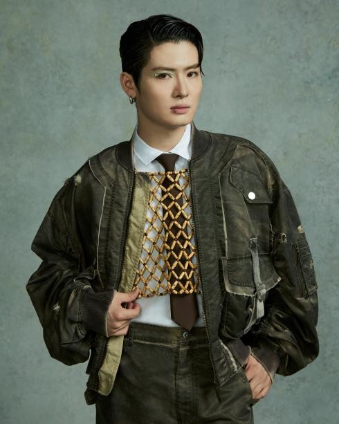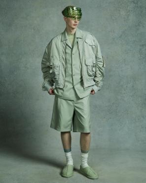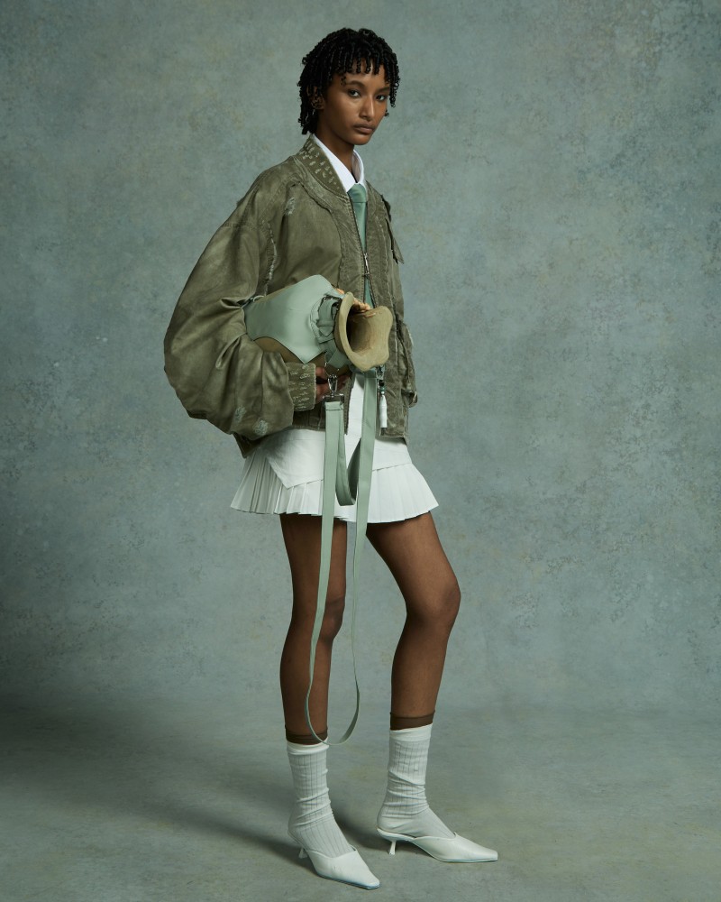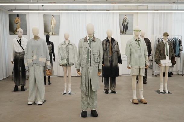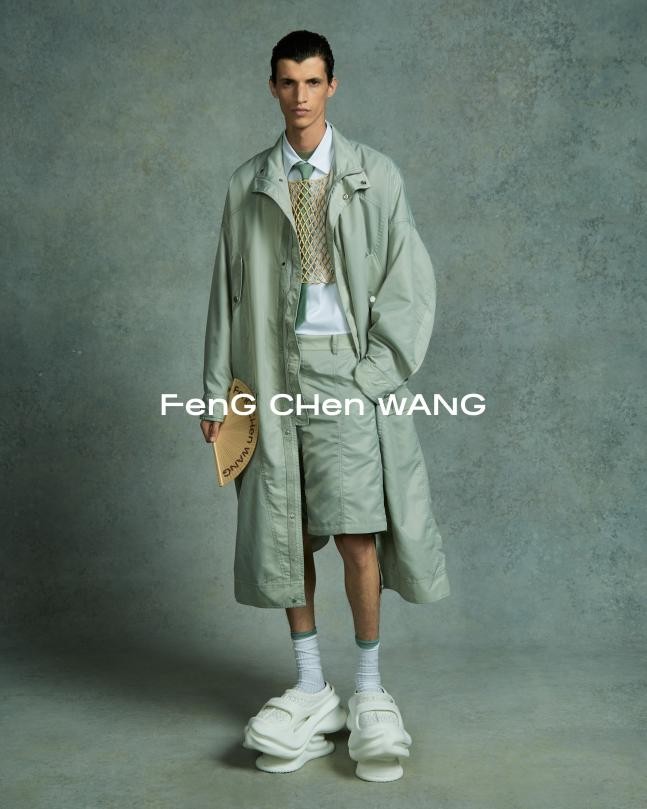 (艺人@力丸RIKIMARU、篮球运动员@阿不都沙拉木 现身2025春夏系列秀场T台) Feng Chen Wang 2025春夏系列,灵感源自于品牌创意总监王逢陈对那些满载岁月痕迹、充满故事的老物件的深情记忆。这一季,她融入了自己长久以来钟爱的东方瓷器元素,通过对传统工艺和现代面料的重新解读,探索了时间、文化与时装之间的联系。每一件服装仿佛穿缝时间,将青瓷的温润质感与现代剪裁巧妙结合,呈现出历史厚重感与未来感的独特美学。瓷器中的青瓷色调巧妙运用在服装的材质和色彩层次上,展陈空间内的青瓷色背景则带有细腻的颗粒与裂纹细节,仿佛时光在其中留下的印记。