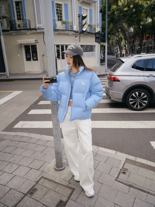 MLB品牌「超搭」羽绒延续品牌经典灵感,以简约立领廓形映衬质感面料,与低饱和色系奶盖白、奶油杏、海盐蓝潮搭碰撞,刺绣LOGO置于胸前点缀与横线绗缝设计巧妙融合,抒发简而不凡的冬日搭案。MLB潮流品牌代言人虞书欣身着奶盖白「超搭」羽绒内搭高腰短款T恤划定出挑比例,下身阔型工装长裤加持率性气场,刷新酷感高街创想。