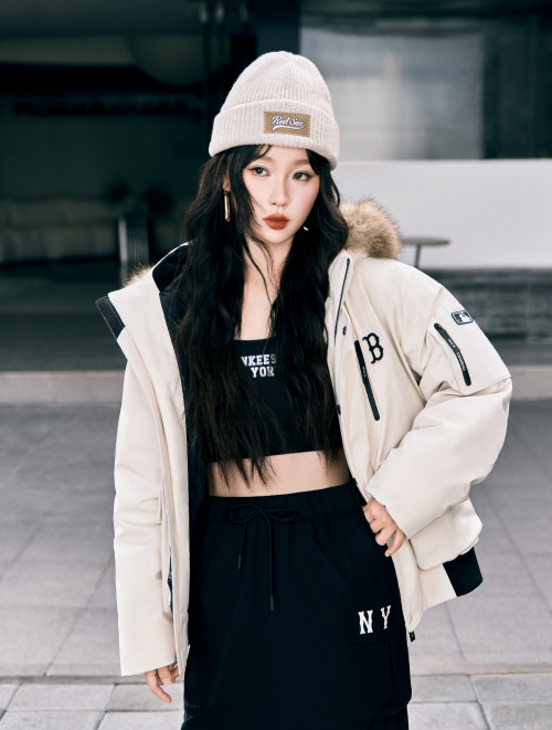MLB潮流品牌代言人虞书欣演绎2024冬季象牙白工装羽绒