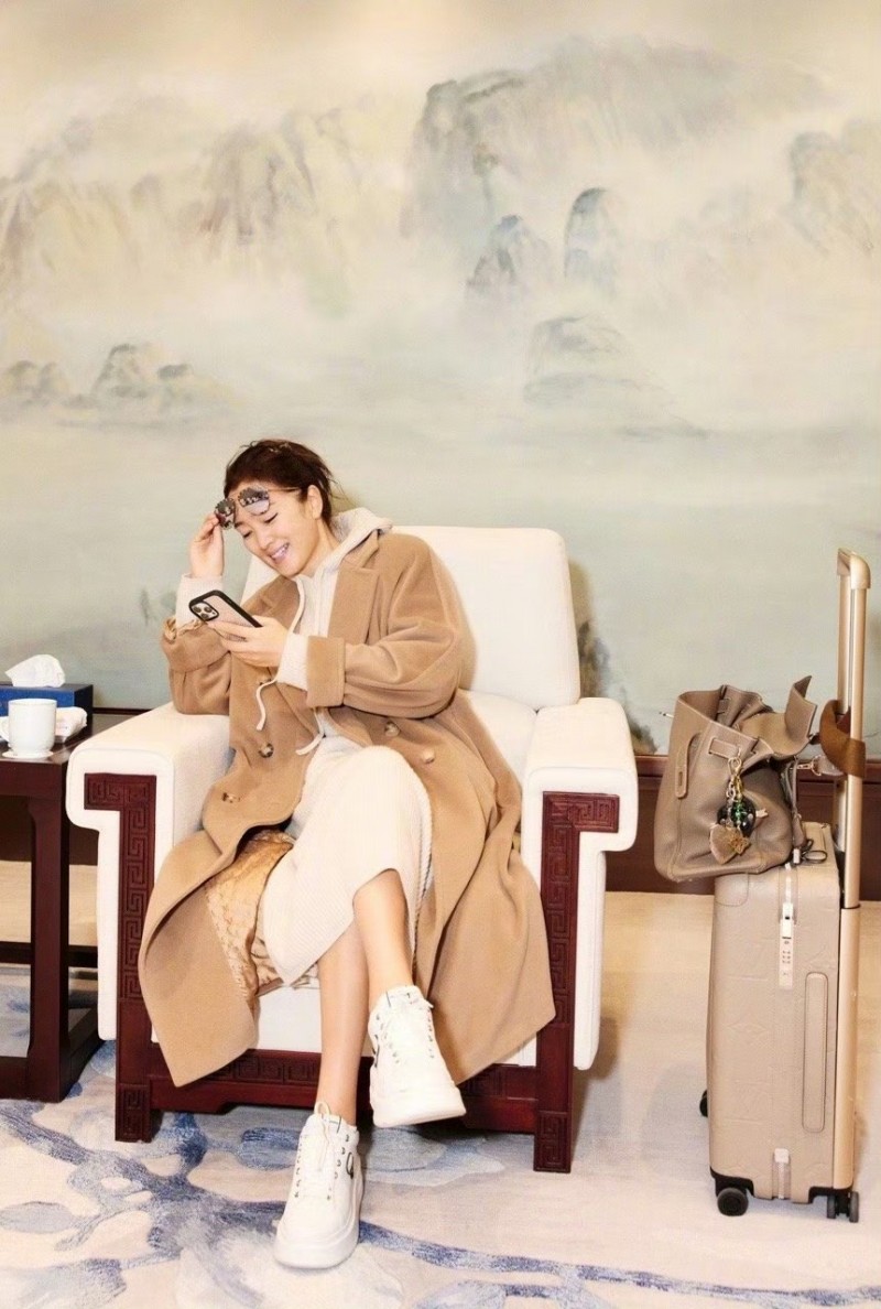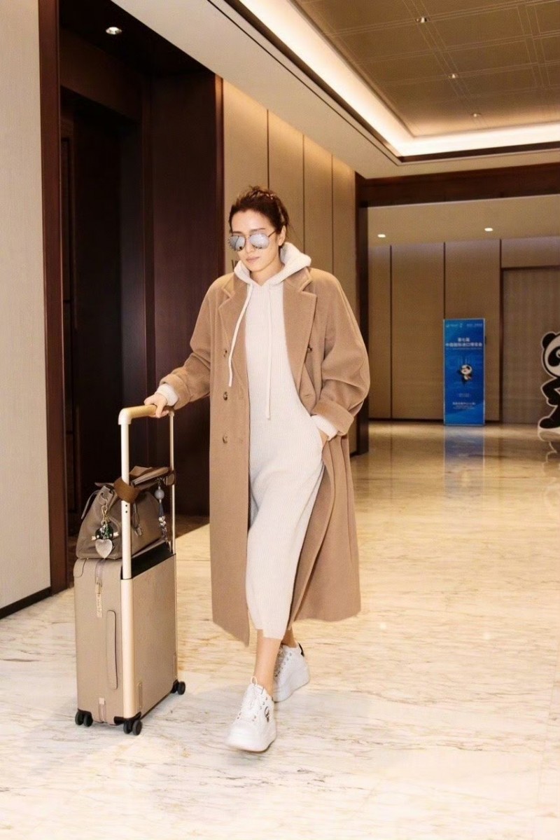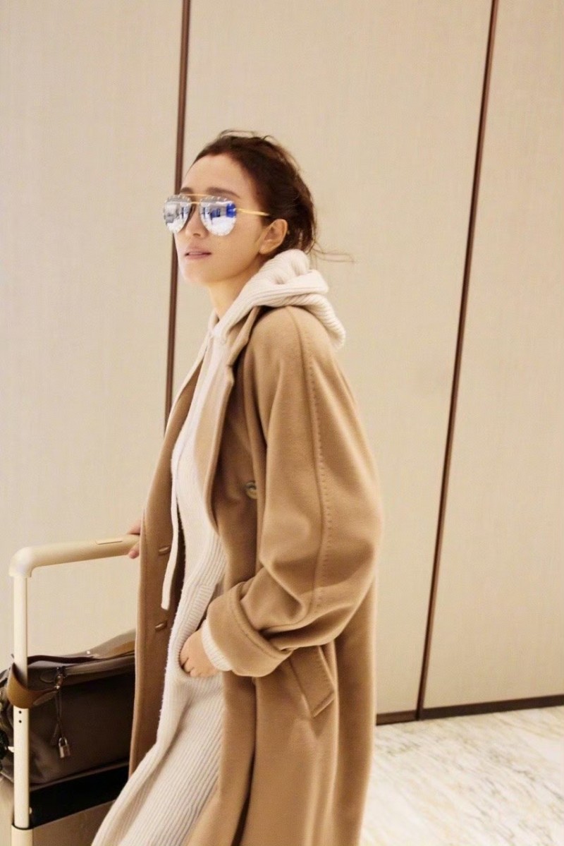 米白色给人以干净、高雅的印象,驼色则增添了一抹温暖与复古的韵味。巩俐此行身着Max Mara 101801 经典驼色大衣,搭配同色系的箱包,一身深秋出行的自在穿搭,既舒适又高级。两者结合,营造出一种既温暖又不失格调的独特氛围。