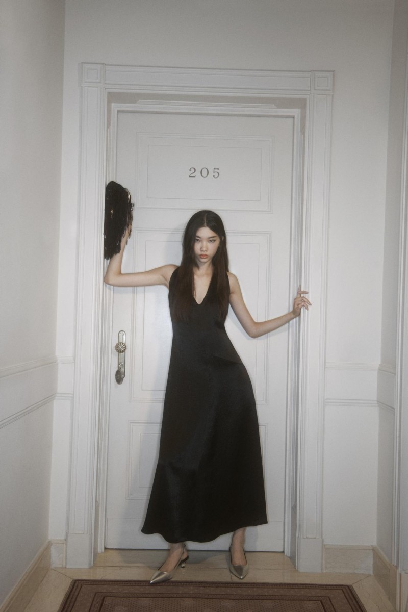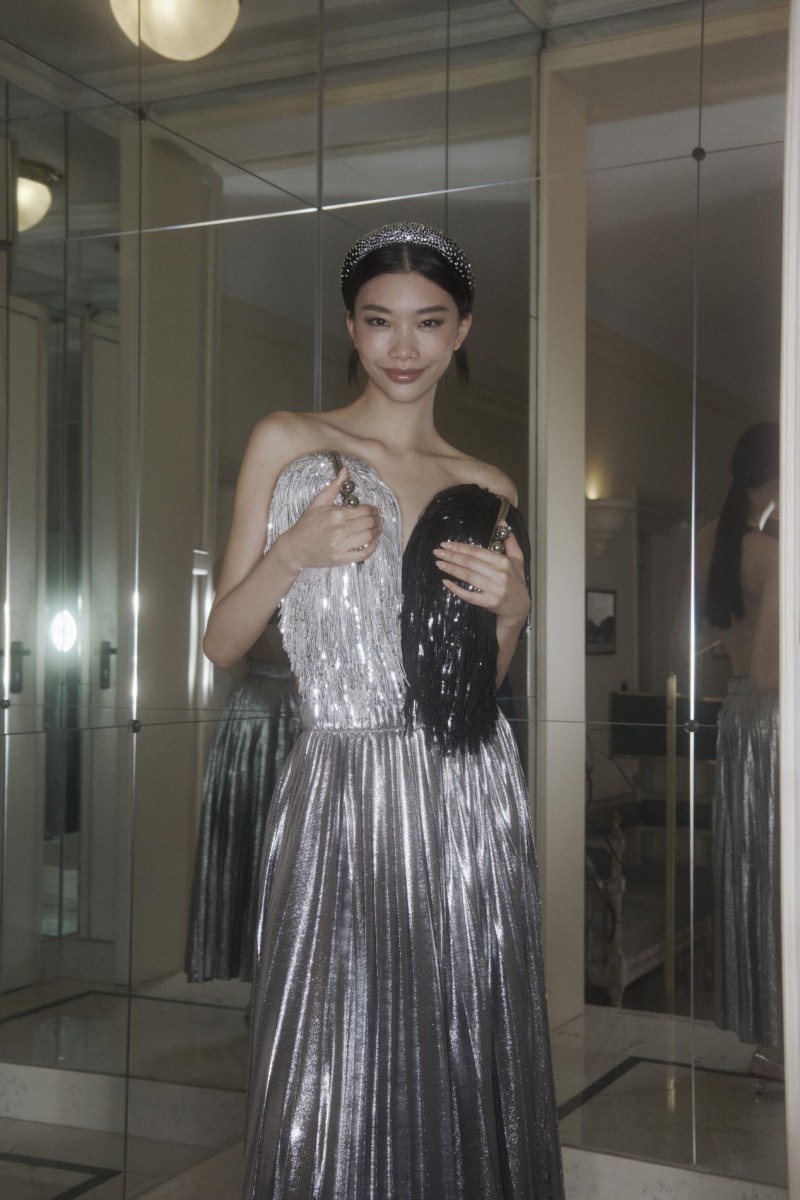 点缀闪亮流苏装饰、修身亮片数字及闪耀卢勒克斯纱线的无袖连衣裙,与象牙色丝绸吊带背心和黑色长款衬衫的简约优雅气质相得益彰。