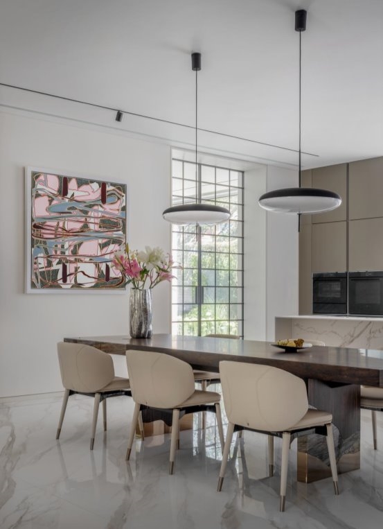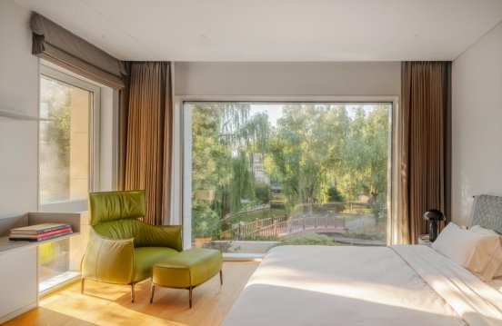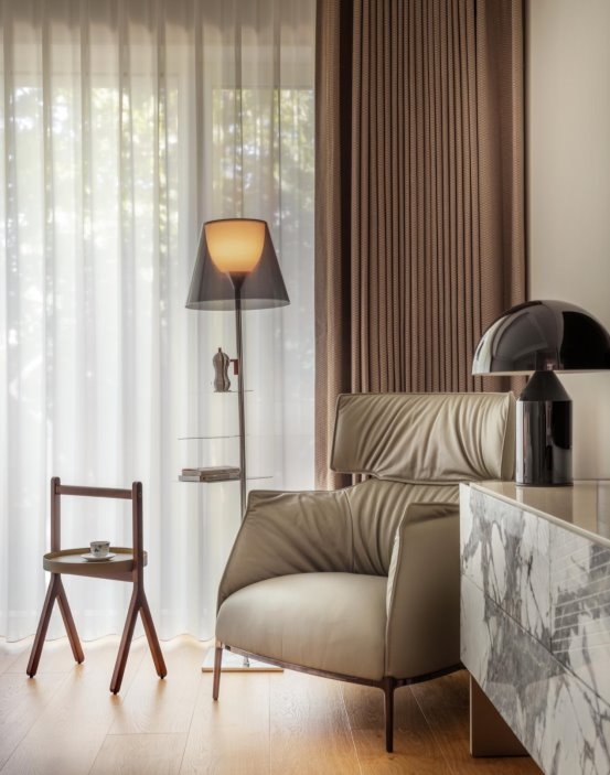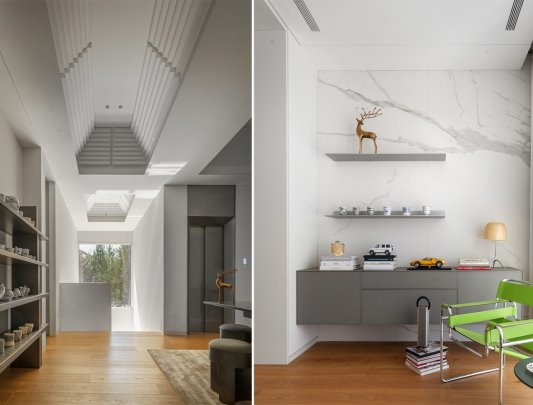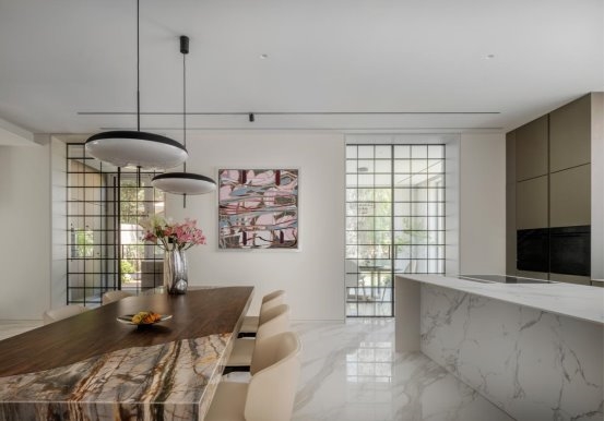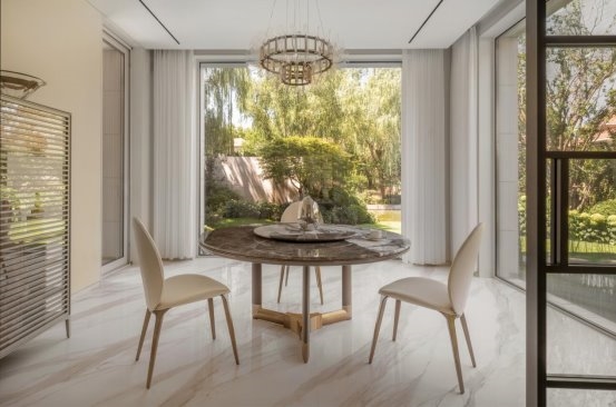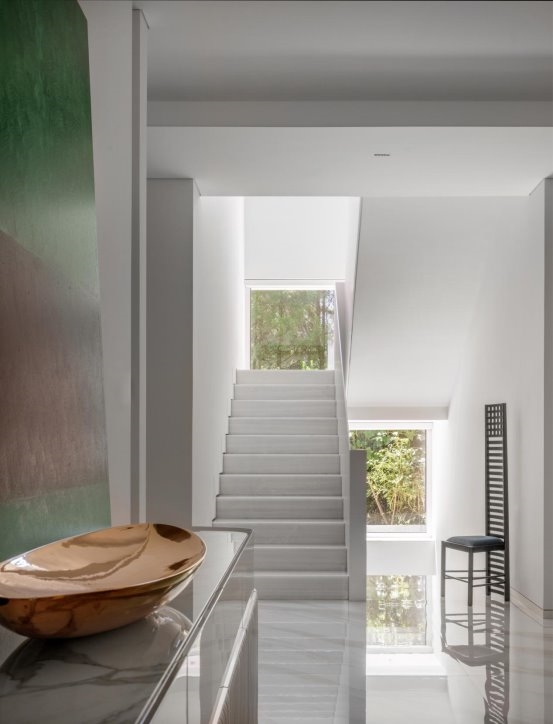 “楼梯空间” "Stair Space" 针对外部的建筑进行重塑,三级叠落,犹如大地捧出的艺术杰作。那层层叠落的轮廓,仿佛是岁月沉淀的智慧,诉说着建筑与自然的对话。将自然与景观被巧妙地引入室内,虚化了室内外的边界。当阳光透过大大的落地窗洒进屋内,那温暖便是大自然最深情的拥抱。窗外的绿树繁花,不再是遥不可及的风景,而是生活中最动人的画卷。“采菊东篱下,悠然见南山。” 在这里,我们无需远行,便能拥有那份与自然相拥的悠然。 The exterior architecture is remodeled with three levels stacked up, like an artistic masterpiece held up by the earth. The layers of outlines seem to be the wisdom accumulated over the years, telling the dialogue between architecture and nature. Nature and landscape are cleverly introduced into the interior, blurring the boundary between indoor and outdoor. When the sun shines into the house through the large French windows, the warmth is the most affectionate embrace of nature. The green trees and flowers outside the window are no longer an unreachable scenery, but the most moving picture in life. "Picking chrysanthemums under the eastern fence, leisurely seeing the southern mountains." Here, we can have the leisurely embrace with nature without traveling far.