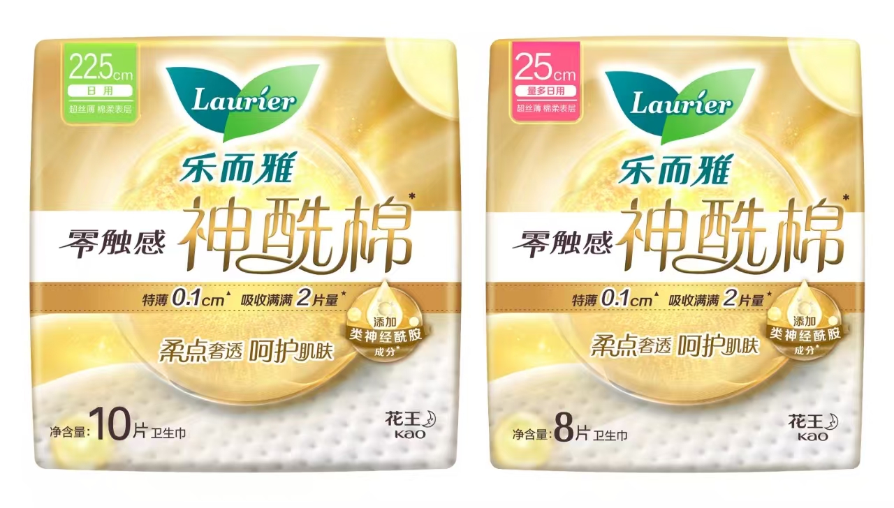 花王“乐而雅”秉持着“你舒服,更重要”的品牌理念,长期致力于为女性提供更舒适的生理期体验。新品“乐而雅零触感神酰棉” 采用柔点奢透表层, 薄薄一片,给予“奢柔”、“奢透”和“奢护”的三重呵护。 “乐而雅零触感神酰棉”表层柔点设计帮助减少肌肤与巾身50%的接触面积*1,缓解摩擦感,“奢柔”亲肤;表层中的凹凸构造形成中空结构利于纵向透气,透气率*1提升230%,让生理期的私密肌肤远离闷湿黏腻困扰,畅享“奢透”舒爽。同时添加花王专研“类神经酰胺成分”*2和三大天然植物精粹*3,“奢护”敏感脆弱的私密肌。 自1985年“花王”发现了肌肤保湿和屏护的关键——“神经酰胺”,至今对该成分的研究已长达40年。神经酰胺在皮肤护理中具有重要作用。它能够通过稳固角质层,渗透角质层深处,填满角质细胞间的空隙,与皮肤本身的神经酰胺和角质细胞一起形成紧密网状结构,从而增强皮肤屏障功能,改善干燥缺水的肌肤状态,在花王旗下的产品中得到广泛应用。