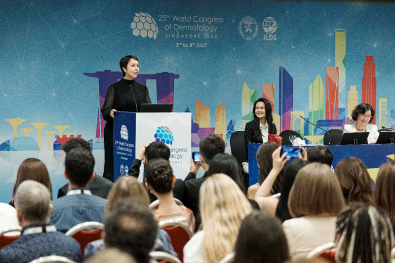 图注:全球首届 SIRT长寿肌因[6]抗老[7]科技峰会 2023年3月,雅诗兰黛联袂权威科学媒体NATURE,举办全球首届SIRT长寿肌因[6]抗老[7]科技峰会,分享了品牌对「色提因™」科技的研发历史及突破性成就,拉开了抗衰传奇的新篇章;同年7月,雅诗兰黛品牌重磅亮相第25届世界皮肤病学大会WCD。WCD是目前规模最大、最负盛名的国际皮肤病学会议之一,全球顶尖的皮肤科医生、病学专业协会和研究专家济济一堂。雅诗兰黛在这一国际化的舞台上发布品牌最新「色提因™」逆龄[1]科技研究成果,进一步解码白金逆龄[1]奥义。