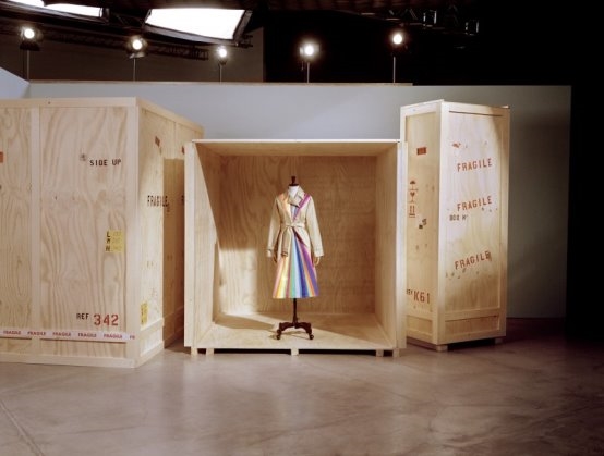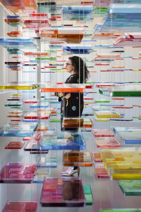 维多利亚·科舍列娃及她的作品 意大利艺术家保拉·皮维以俏皮而富有张力的创作语言著称。她热衷于打破既有语境,通过错位与反差制造视觉悖论。当 Canasta 风衣被寄至她位于夏威夷的住所时,一种强烈的“错位感”油然而生。意大利精裁的防雨风衣,与海岛悠闲氛围之间形成奇妙碰撞。她回忆道,当自己站在车库与卫生间镜前时,窗外葱郁绿意与天窗洒落的空灵光线交织成一道仿佛自肚脐延展的彩虹光谱。由此,“光”成为创作核心。夏威夷几乎每日可见的绚丽彩虹、丰沛植被与自然能量,被转化为风衣正反面垂直排列的多彩条纹,构建出收束于腰部的沙漏廓形。她将这件作品视为一种全新的时尚语汇——融合未来感、时空感与玩趣精神。